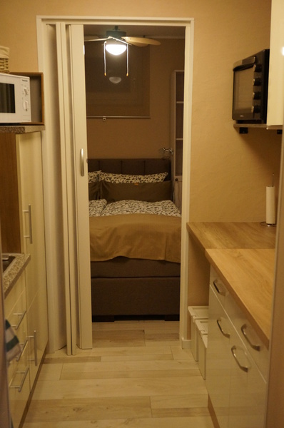 sowie einem großen Kühlschrank mit Gefrierfach ausgestattet. Das Schlafzimmer 1 ist mit einem 160x200 cm großem Boxspringbett ausgestattet. Das 2. separate Schlafzimmer hat ein großes Futonbett mit