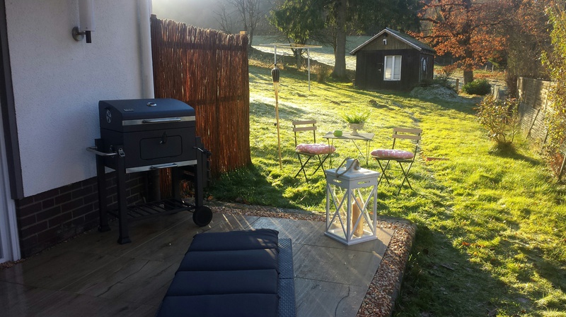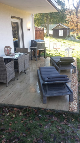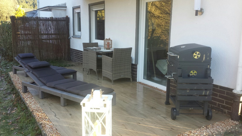 Waschtisch. Infrarotsauna bis 60 Grad C. Ebenerdige Terrasse mit Garten. Wohnzimmer mit Fernseher,DVD Radio/CD große gemütliche Couchgarnitur sowie ein Designer-Kamin der mit kostenlosen zur